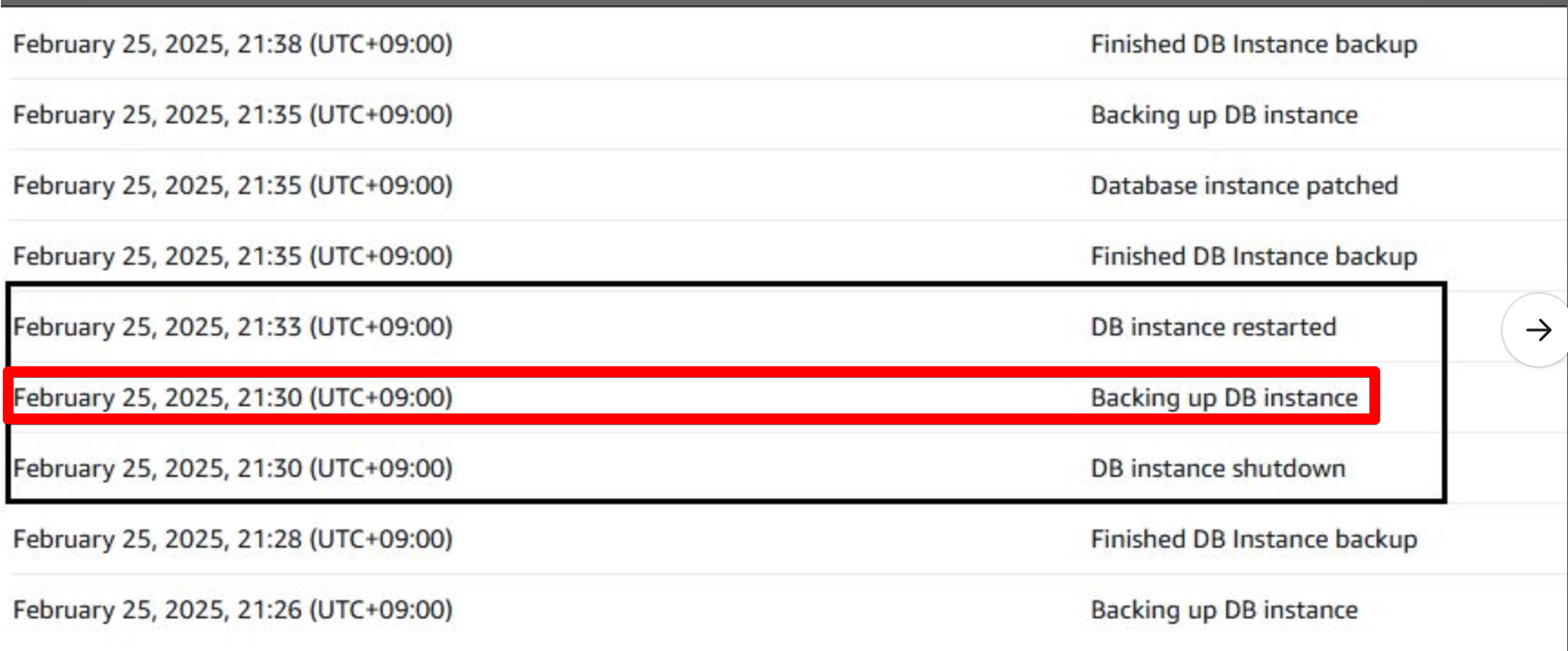 * 이벤트 로그에 빨간 박스의 Backing up DB instance는 자동 백업 설정되어있으면 동작함, 검은색 네모박스가 실제 DB downtime -> 자동 백업 설정을 off 하면 1분 줄어듬