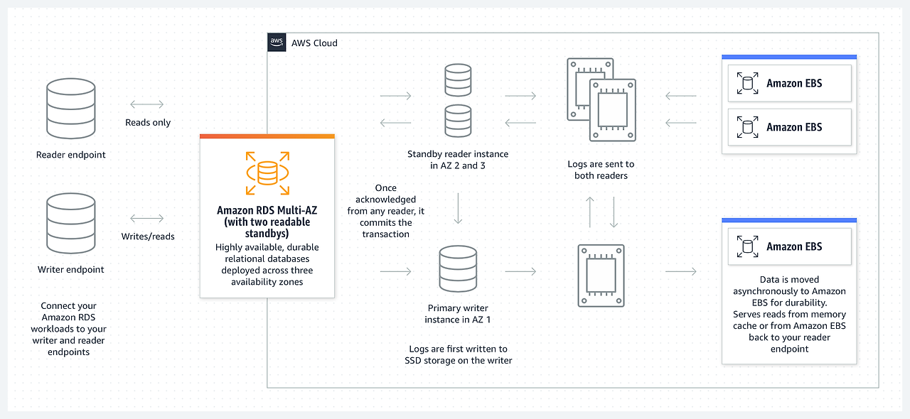 읽기 가능한 대기가 2개인 Amazon RDS 다중 AZ를 사용하여 3개의 AZ에서 고가용성, 내구성 MySQL 또는 PostgreSQL 데이터베이스를 배포합니다. 일반적으로 35초 이내에 자동으로 장애 조치되고, 대기가 1개인 Amazon RDS 다중 AZ 대비 트랜잭션 커밋 지연 시간이 최대 2배 더 빠르며, 추가 읽기 용량이 있고, AWS Graviton2 또는 인텔 기반 인스턴스를 컴퓨팅에 선택할 수 있습니다.